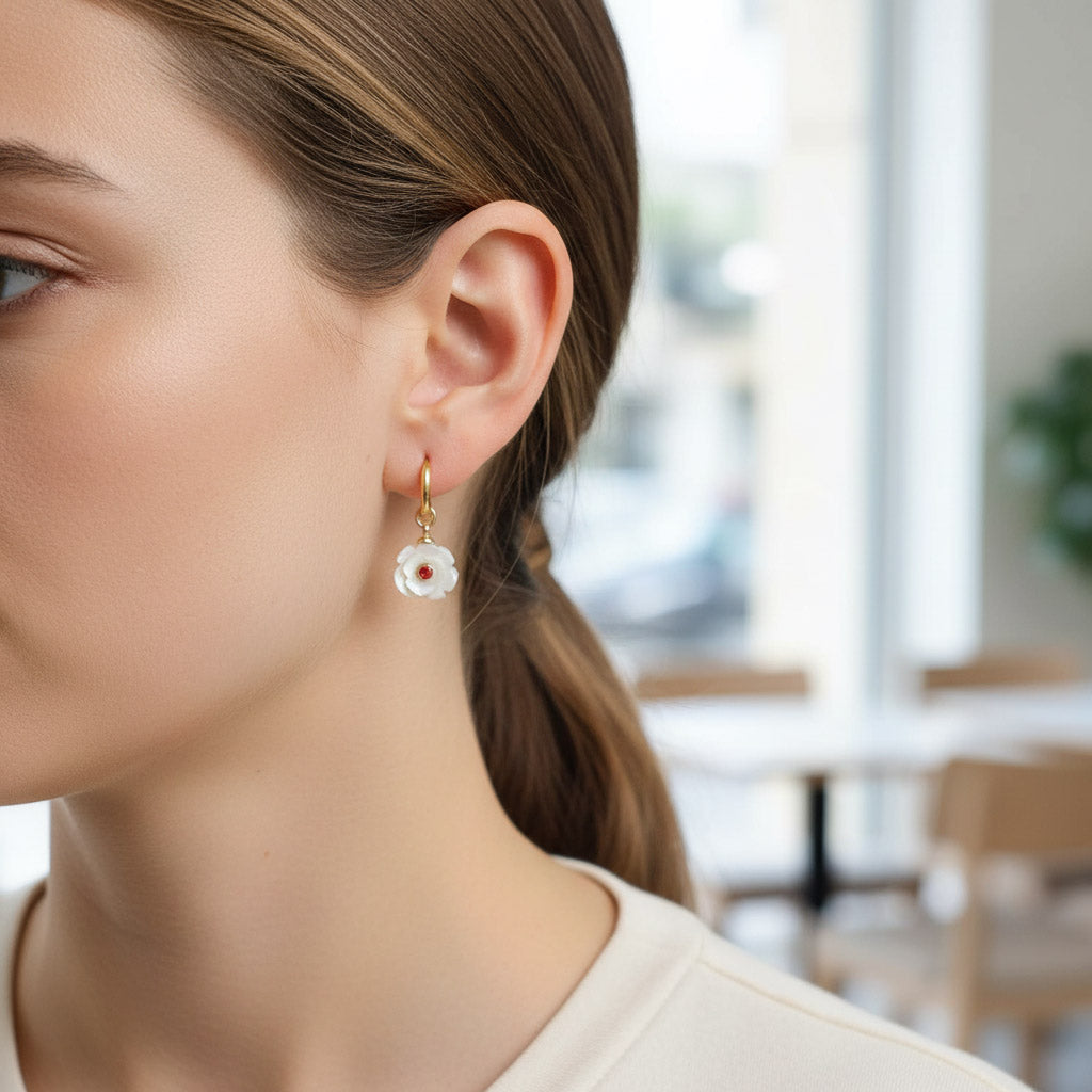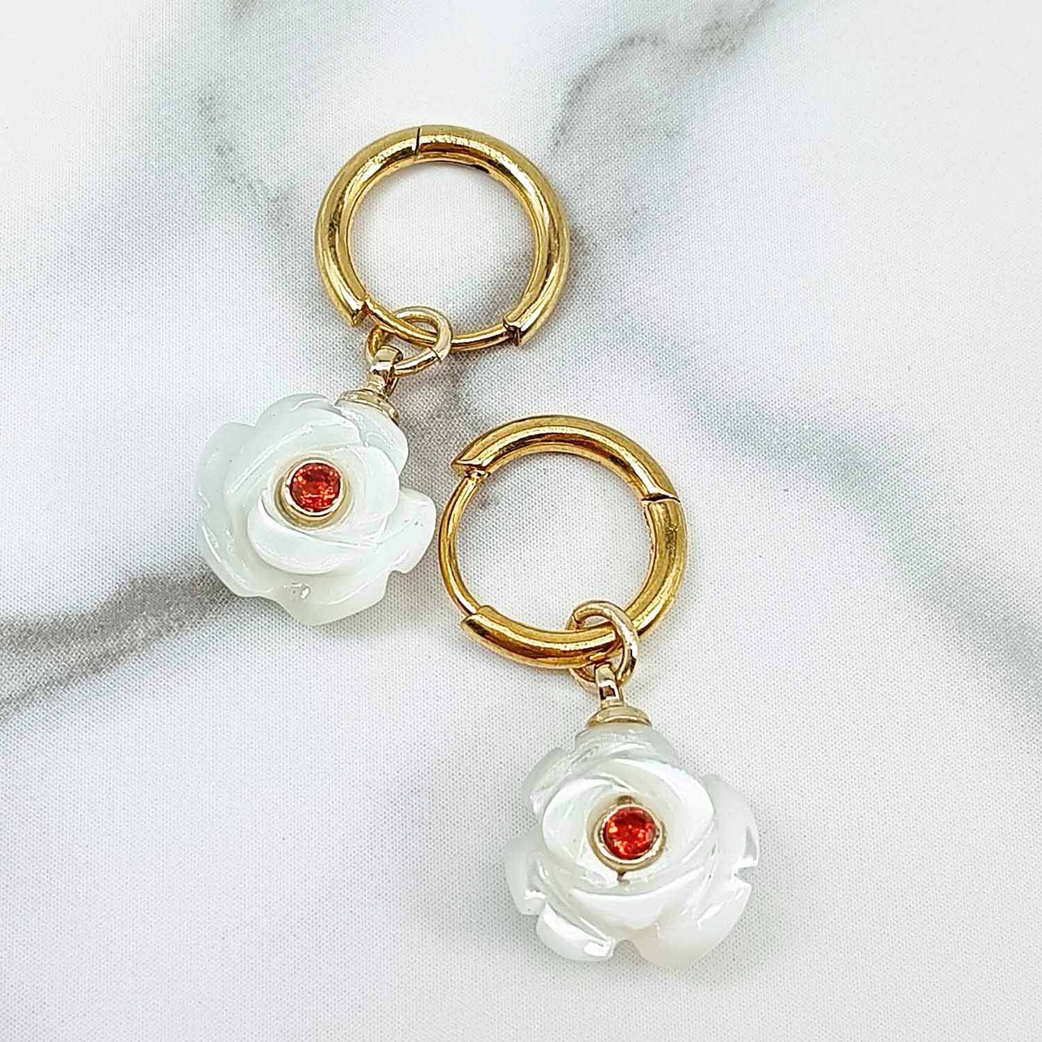 Bring a touch of timeless elegance and personal meaning to your look with PearlBloom Birthstone Hoops. Featuring delicately hand-carved mother of pearl flowers, each bloom cradles a sparkling birthstone-colored crystal at its center – symbolizing love, individuality, and celebration.