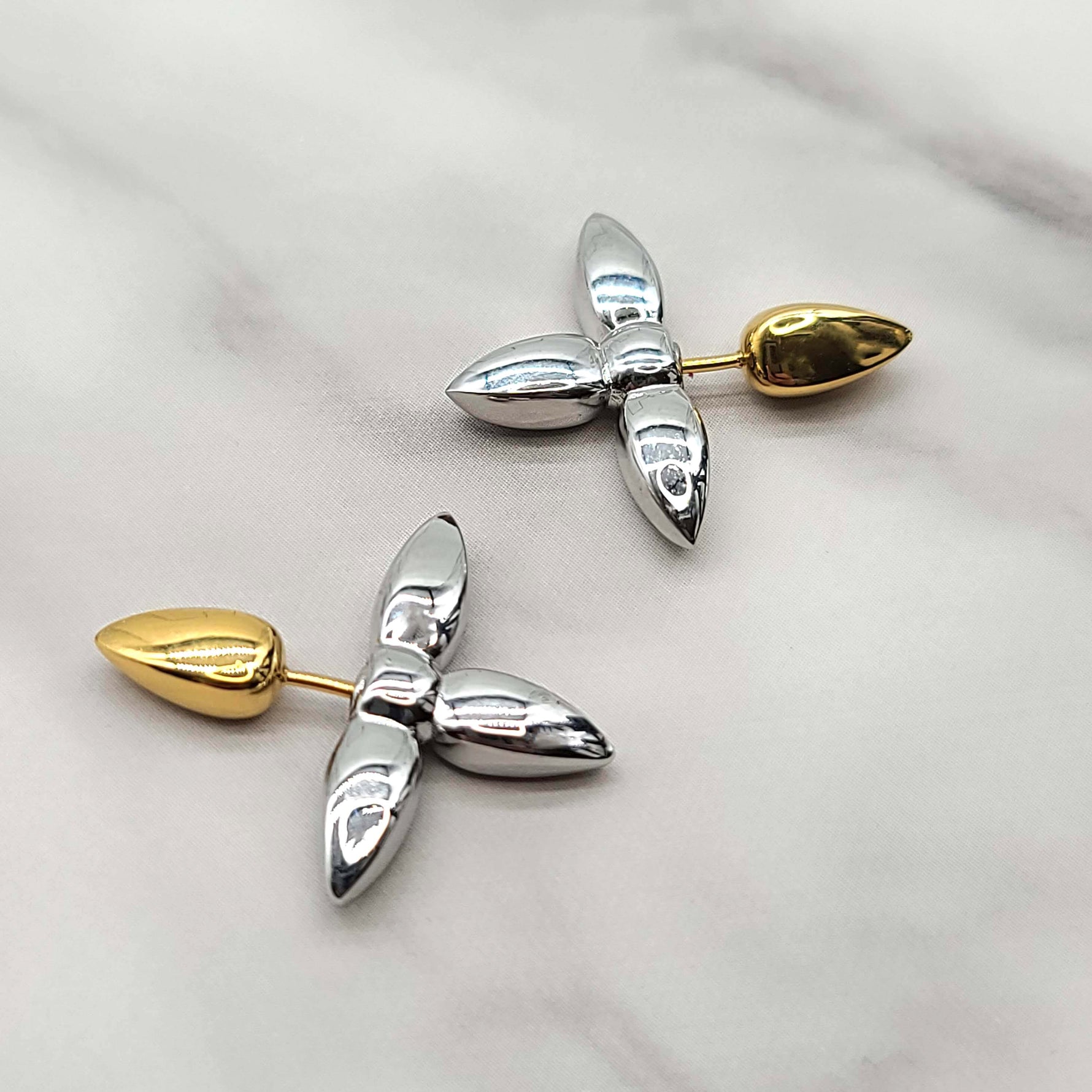Unit price perDelight in these tasteful two-tone gold and silver clover back front stud earrings, adorned with a single pearl for an exquisite touch. A subtle hint of luxury, these earrings are sure to add an elegant appeal to any ensemble.
