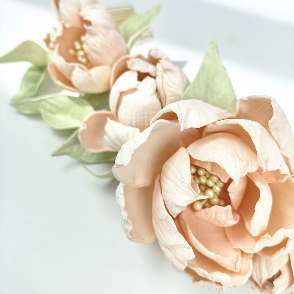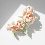 Design: Romantic blush peony hair accessory with lifelike petals and leaves