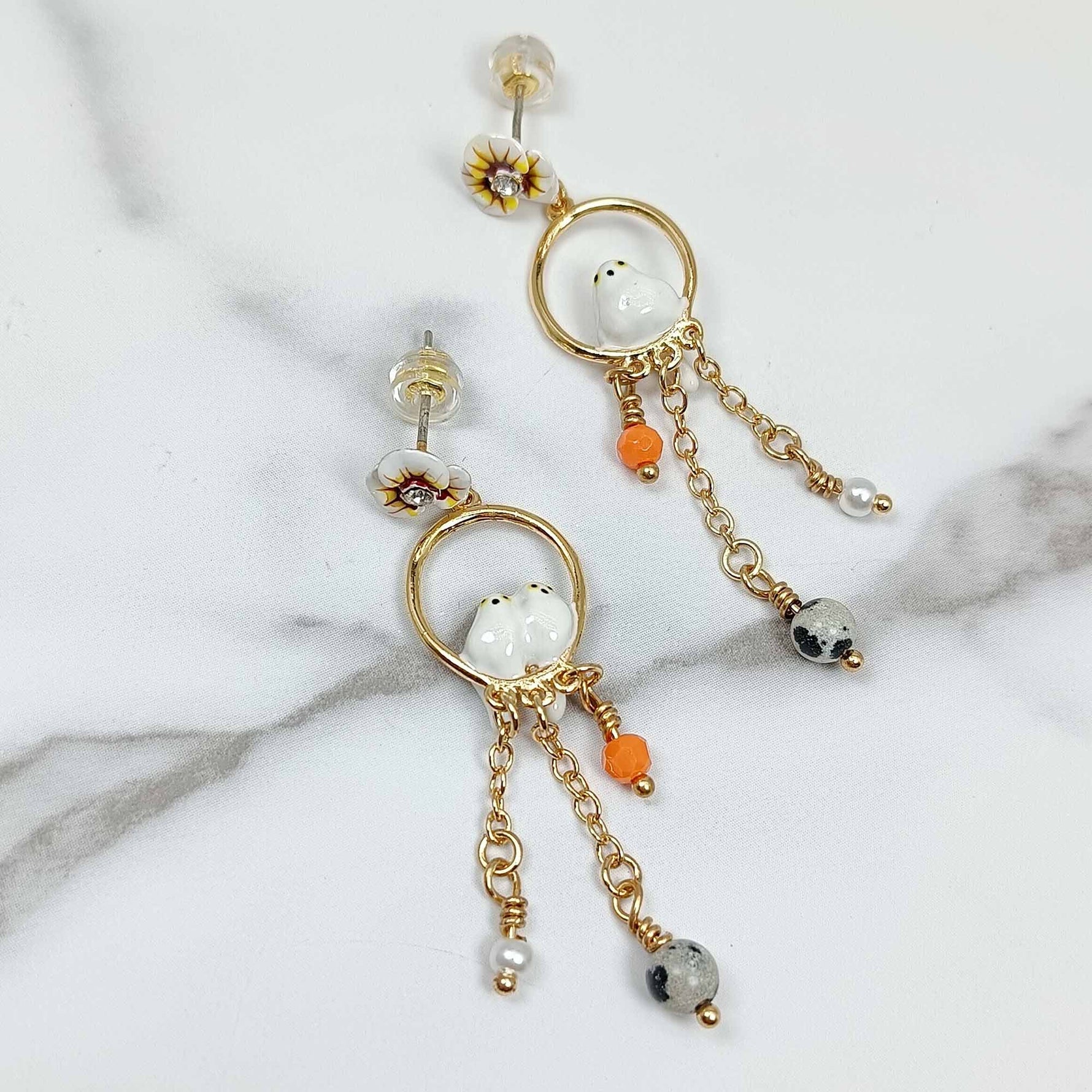 Handpainted Enamel Asymmetric Blue Tit and Pansy Earrings